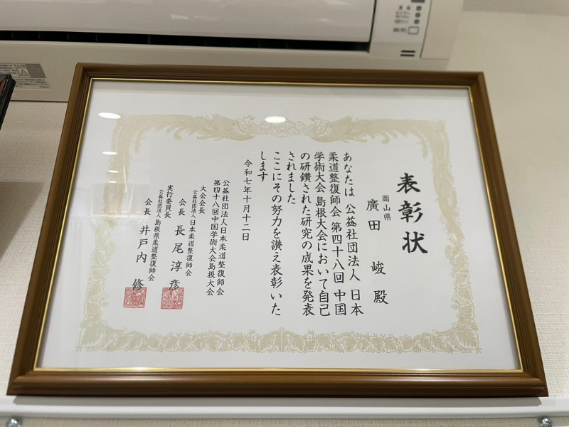 倉敷ひろた整骨院・はりきゅう院として会員発表の部最優秀賞を受賞いたしました。
